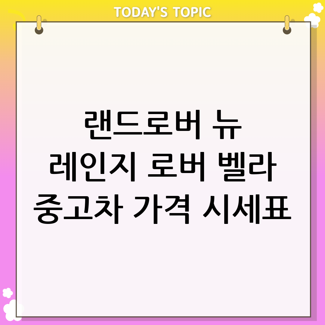 중고차 가격은 여러 요소에 따라 달라집니다. 랜드로버 뉴 레인지 로버 벨라 중고차의 경우, 연식, 주행거리, 차량 상태가 주요 요소입니다. 다음은 대략적인 가격 범위입니다: